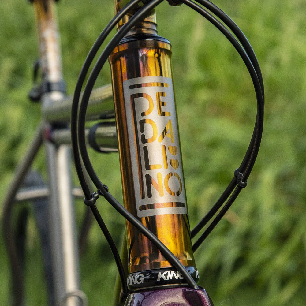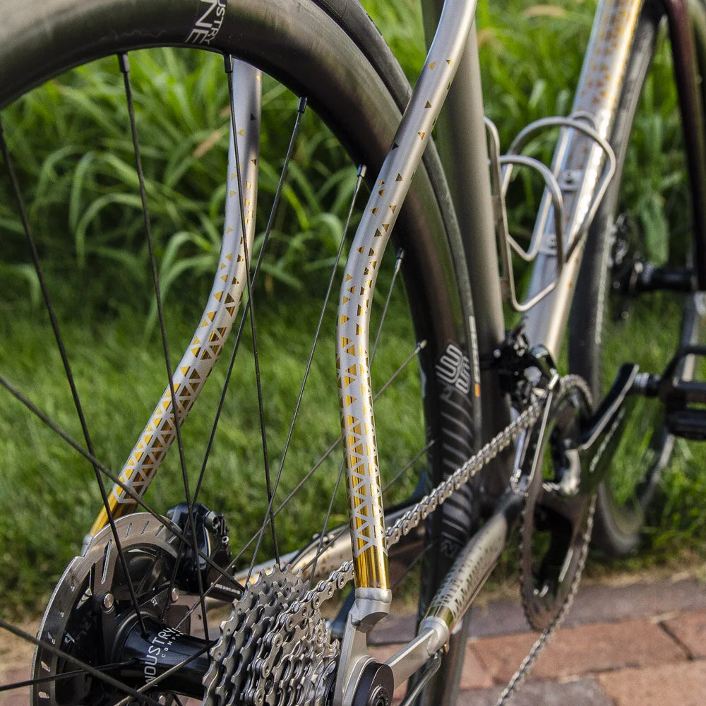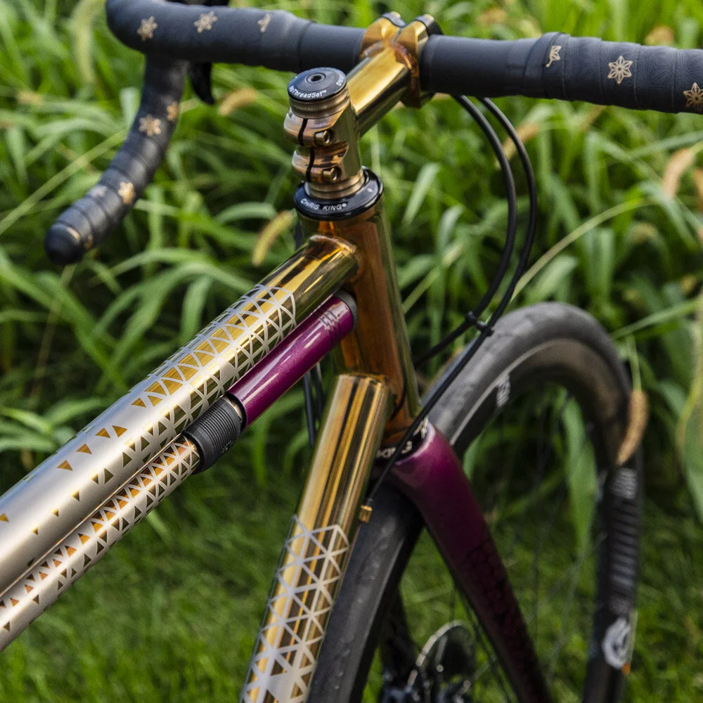 Titanium TIG welded frame with matching custom seat post, stem, and titanium Silca frame pump. Geometric anodized finish done in-house. Fork painted by Jordan Low at Hot Tubes Paint.