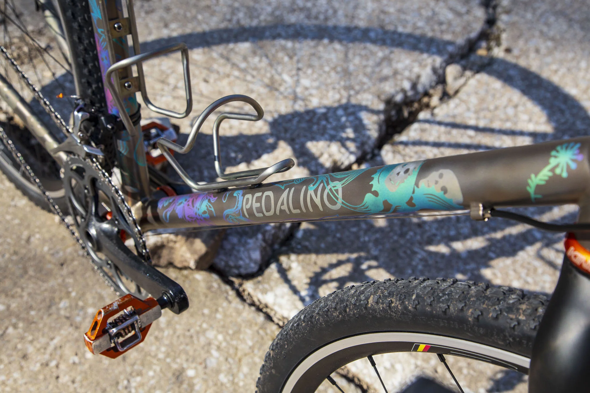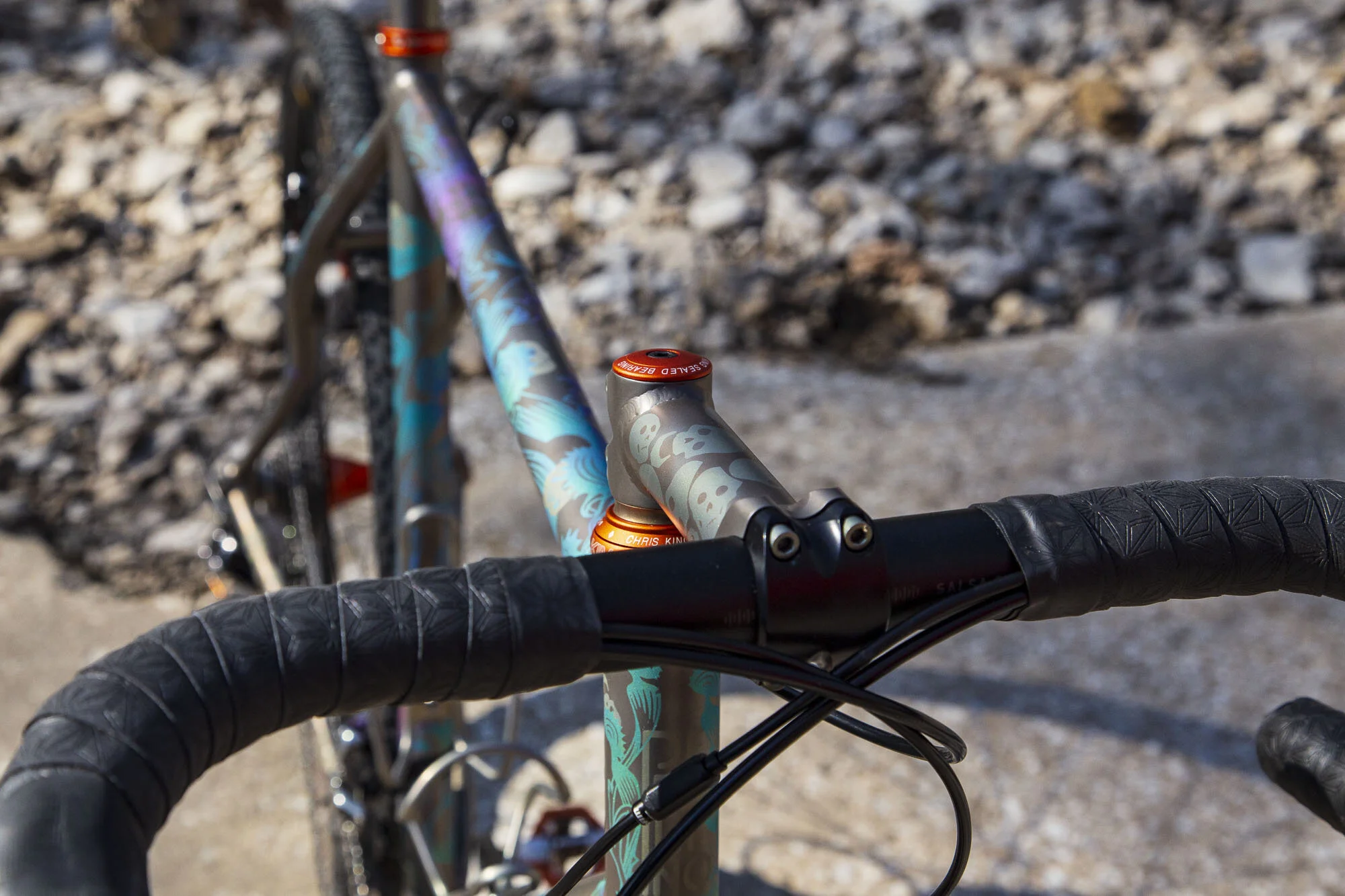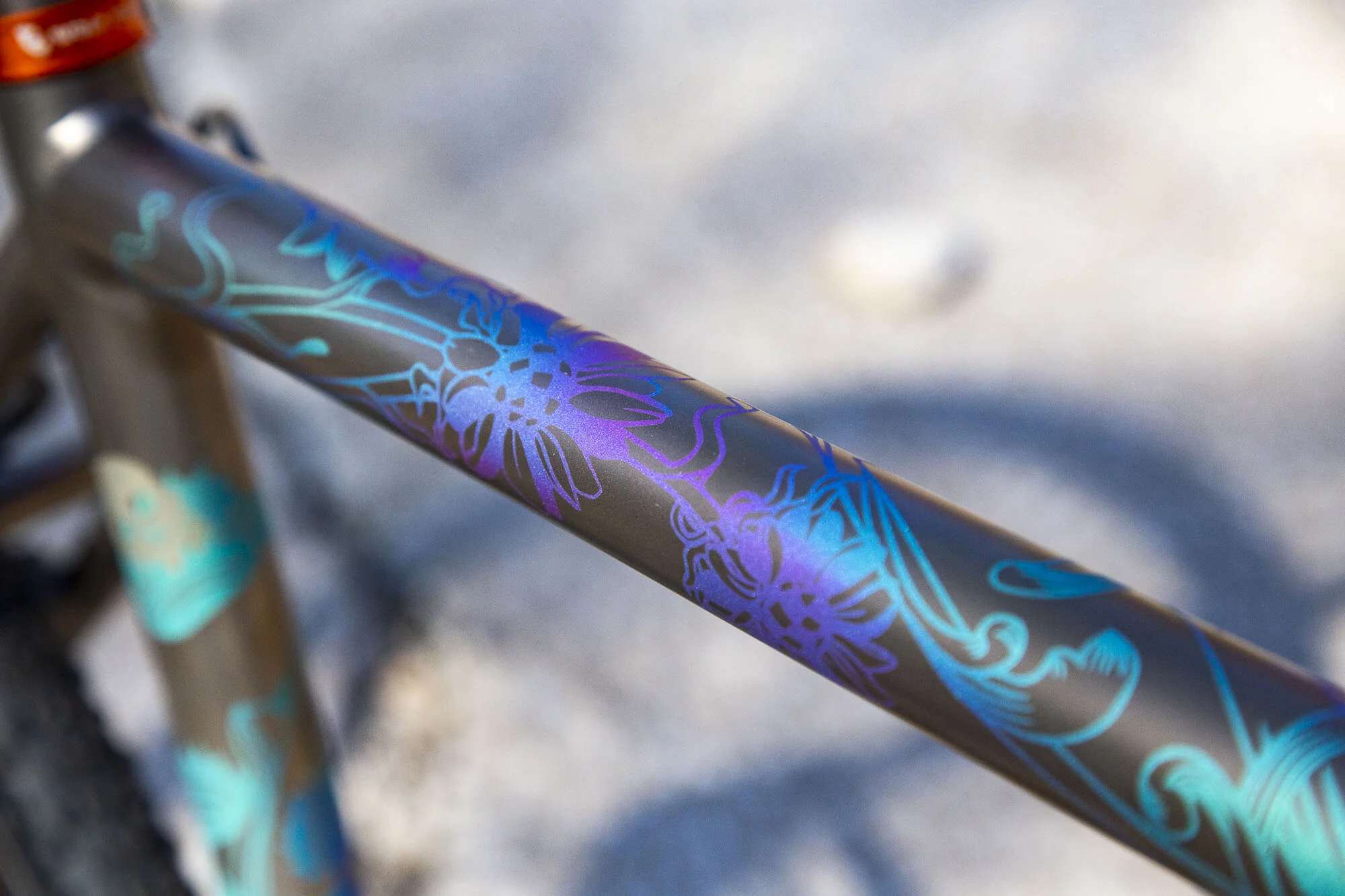 Titanium TIG welded frame, anodized in-house with hand drawn artwork featuring skulls and venus fly traps. Matching custom titanium stem and seatpost.